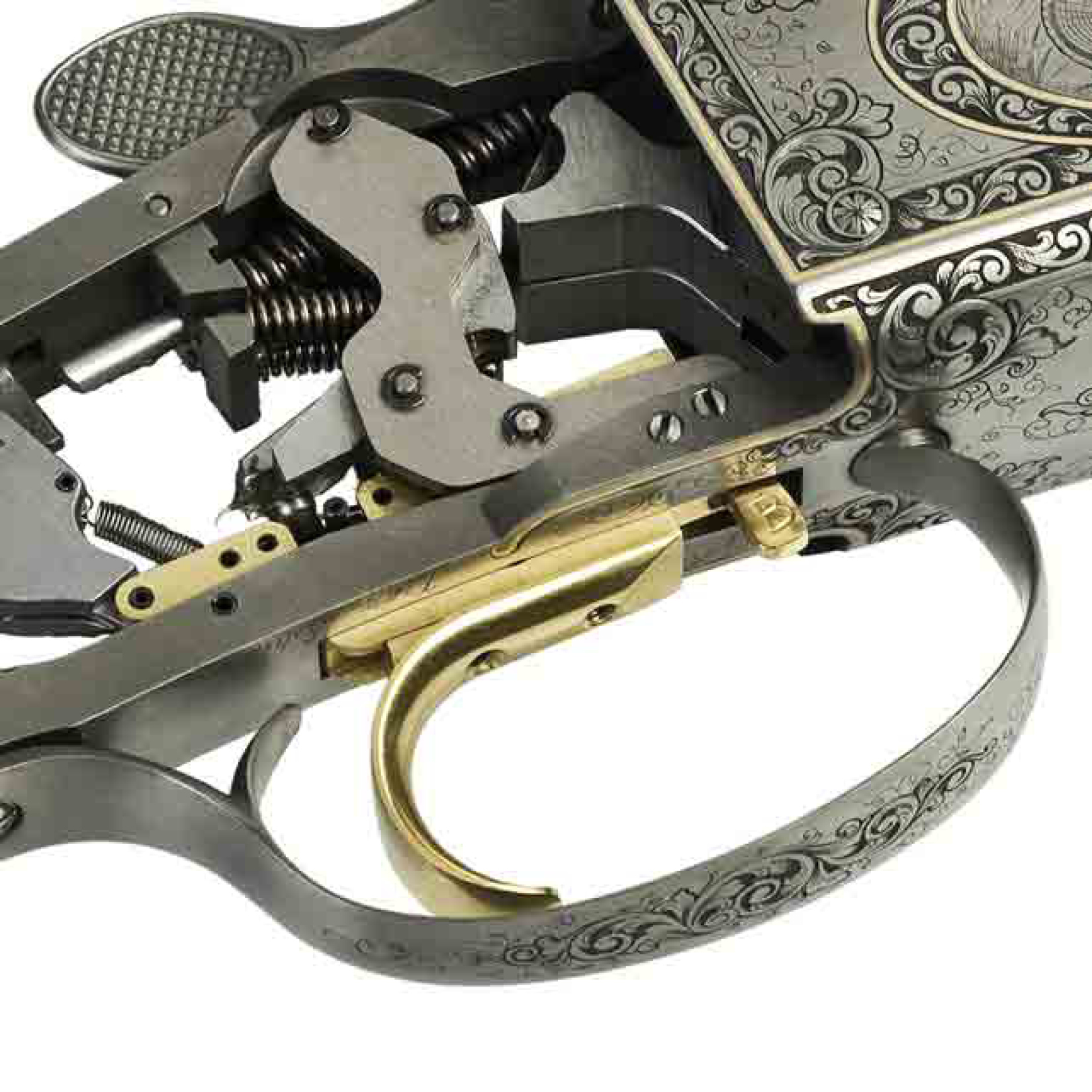 The K-80 and K-20 top latch is an iconic part of our shotguns. It's how shooters can easily identify the K-80 from other guns on the field. It's also one of the most common upgrades as individuals look to put a personal flair to their gun. Our most notable top latch is the Golden Broken Target, but the choices are endless. Here are some examples of top latches and trigger guards we've provided in the past. Check with the Parts Department to see what we have in stock, or how to order a fully custom engraved top latch or trigger guard.